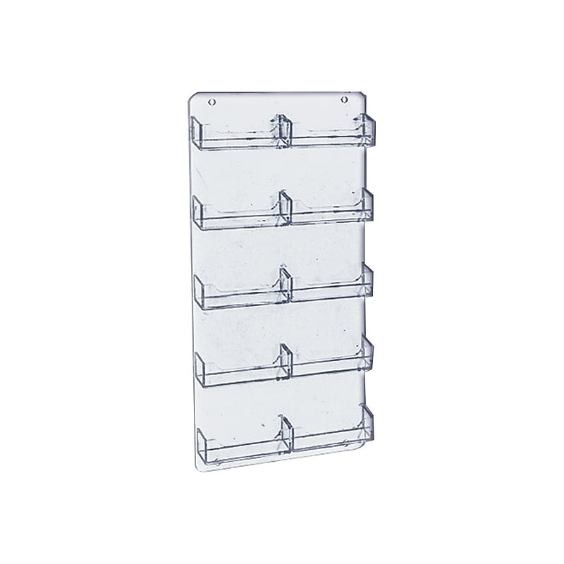 Create a central location for distributing business cards or selling gift cards with this 10-pocket card holder. The low-profile compartments keep printed information visible, while the wall-mount design offers easy access. This Azar Displays wall-mount card holder is crafted from durable acrylic for long-lasting use. Wall holder effectively displays marketing materials to clients and business associates.acrylic offers durability and better visibility. Top loading design with magazine orientation. Dimensions: 15. 75"H 8. 5"W. 10 pockets for easy arrangement of different literature types. Two per pack. Can be mounted on a wall for easy viewing. Let staff distribute contact information or showcase company gift cards with this Azar Displays 10-pocket wall-mount business/gift card holder.