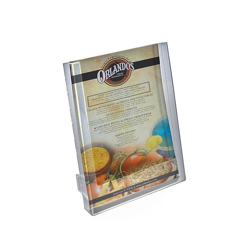 Ensure maximum visibility of your advertising material, magazines or books with the Azar Displays' Letter Size Brochure Holder. It has a single pocket and is designed to hold display literature that measures 8. 5 11 inches. Crafted from crystal styrene , this sturdy unit withstands the rigors of everyday use and is easy to assemble. Itsbody makes it easy to view and choose literature that's placed in the pockets and has been designed to stand on countertops, tables or desks. Single-pocket brochure holder for organizing promotional material, magazines, books etc. Crystal styrene construction to ensure long-lasting use. Transparent make for easy visibility of the contents. Can be placed on counters, desks or tabletops for display. Dimensions: 9"W 1. 25"D 11. 25"H. The Azar Displays Single-Pocket Brochure Holder is designed to hold letter size promotional literature, to be placed on counters, tables or desks.