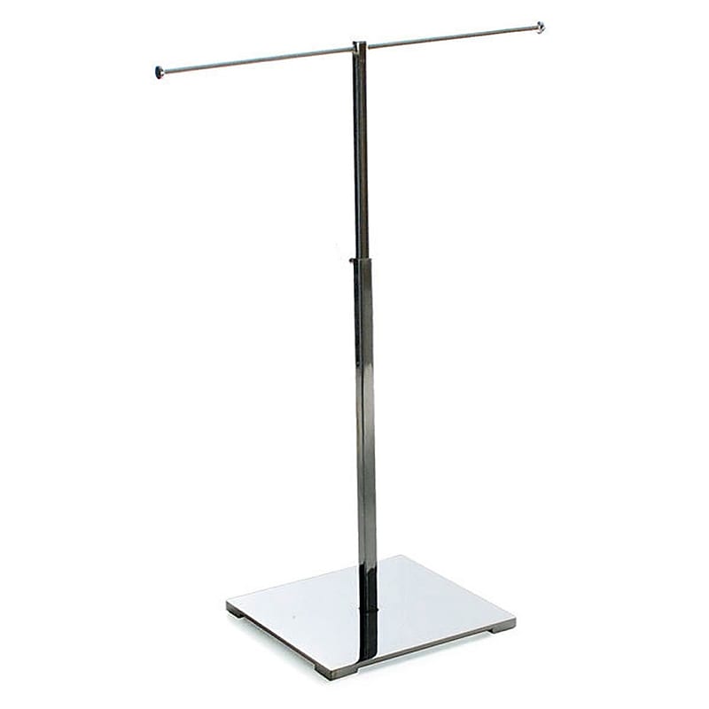 Necklace display features a T-bar with adjustable height from 14" to 25" that allows you to display necklace. 13" Chrome bar display stands on a 7" square base. For displaying necklace. Poles: 1. Adjustable center upright. Chrome. 14" - 25"(H) x 13"(W) chrome bar, 7" base. Includes: 1 x chrome bar. Stands on a square base. Single pole necklace display features one 13" chrome display bar for jewelry display.