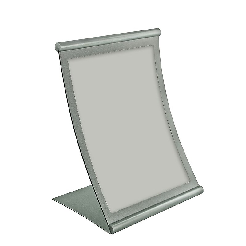 Utilize the free space on your product racks or tables for advertising your store with the Azar Displays Sign Holder. Featuring a contemporary metal frame, it offers enhanced durability and sturdiness. Equipped with a flip open magnetic lens, it offers easy loading and unloading of graphics. With a wide base, this sign holder offers superior stability. It is Perfect for displaying printed material and can be placed on counter tops and reception desks for enhancing visibility of your special offers and promotions. Metal construction for durability. Contemporary design specifically for counter tops. Non-glare magnetic lens protects printed graphics. Allows easy loading and unloading of graphics offering seamless and quick signage change. Dimensions: 11''H 8. 5''W. The Azar Displays 8. 5" Curved Counter Metal Sign Holder features flip-open magnetic non-glare lens, apt for displaying and protecting graphics on counter tops.