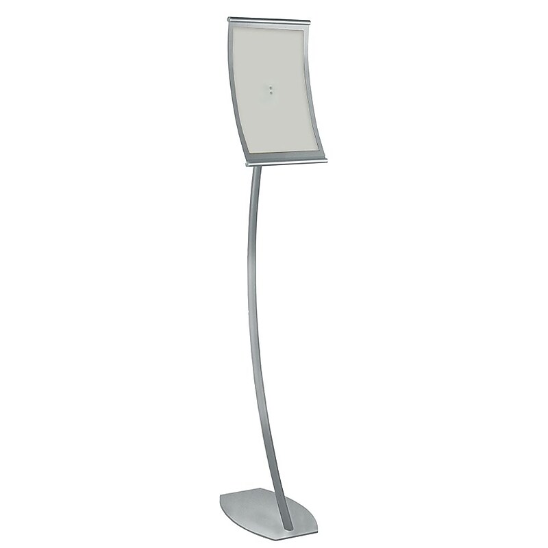 Display the seasons sale or special offers outside your shop entrance or on the sidewalk using the Azar Displays Metal Sign Holder. Well-designed with a tall, vertical and curved frame, it is perfect combination of style and functionality, allowing you to load and unload graphics with ease. Its powder coated metal frame makes it highly durable. This curved sign holder is perfect for displaying sign at any place in your restaurant, cafe or store. Table top sign holder to ensure maximum customer visibility. Metal make lends strength and durability. Silver finish lends an aesthetic appeal. Flip-open design makes it easy to use. Non-glare lens to protect graphics. Dimensions: 14"H 8. 5"W (Sign-holder dimension); Floor stand dimensions: 58"H 9. 5"W 14"D. The Azar Displays Curved Metal 8. 5" Floor Sign Holder features flip-open magnetic lens, making it apt for counter-top displays.