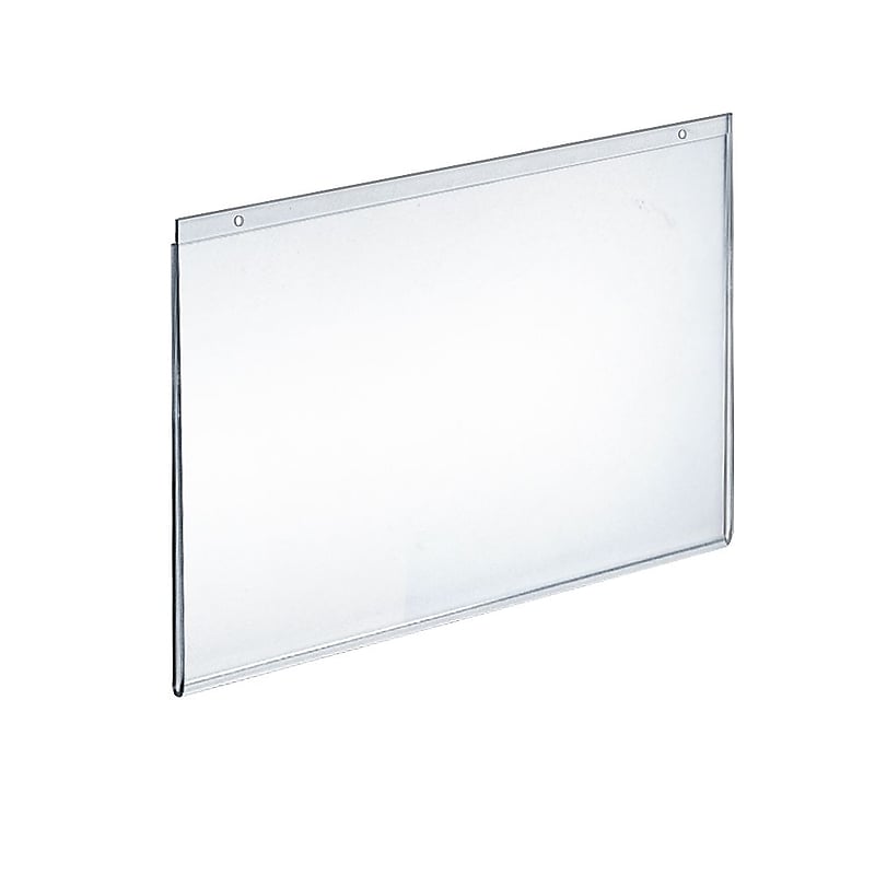 Display your exclusive offers on a product or menu item by hanging the Azar Displays Horizontal Sign Holder on your restaurant's wall. It features pre-cut holes on two corners for easy and convenient wall mounting. For improved durability and ease of use, this wall mount sign holder is made of tough acrylic. It also features a side load design for easy insertion of any printed material, which you can change whenever you want. Measuring 11"H 14"W, this acrylic sign holder allowsdual-sided viewing of important information or special discounts, making it ideal for restaurants, stores or hotel receptions. Acrylic construction for withstanding rigors of everyday use. Transparent design enables easy visibility of signage. Comes with pre-cut holes on two corners to hang easily on walls and doors. Conveniently display signage on pegboard, slatwall and gridwall wall systems and displays. Available in a pack of 10. Dimensions: 11"H 14"W. The Azar Displays Horizontal Acrylic Wall Mounted Sign Holder measures and features pre-cut holes for hanging signs conveniently on walls and doors of your store.