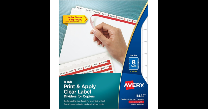 Dont waste time and money ordering custom printed binder dividers with tabs when you can easily create and print personalized dividers with Avery Index MakerLabel Dividers for copiers. Easily customize your title tabs using the free templates on the Avery website. Once youre ready to print, feed the Easy Peel label sheet through the manual bypass tray of your copier for clean, professional looking results in minutes. This pack comes with five sets of 8-tab dividers, and the Easy Apply clear label strips make it simple to apply all 8 labels of each set at once. Just print, align labels against tabs, smooth down labels and peel up strip. Each 3-hole punched durable divider also features doubled-sided, reinforced tabs and edges to help resist tearing for long-lasting, everyday use. These 3 ring binder dividers with tabs are a great addition to your medical office supplies, school binders, personal organizers, tax office supplies, presentation reports and more. Print, peel, and press your way to a perfect, precise project. Save time and money by creating your own high-quality custom tab dividers using free templates from the Avery website and printing on your copier. Label all 8 tab dividers at once with the Index Maker Easy Apply Label strip that results in five perfectly aligned sets of tabs. Get a professional, printed-on look with clear labels that virtually disappear on the white divider tabs. Great for organizing your medical document binder, meeting materials, proposals, tax organizer binder, financial planner and more. Long-lasting, tear-resistant tabbed dividers feature doubled-sided reinforced tabs and edges. Tab dividers let you organize projects, personal documents, and more. Made of white paper with clear tabs. Dimensions: 8. 5"W x 11"L. Eight-tab set of three-hole punched dividers. Five sets per pack. Assemble large project binders quickly with this 5-count set of Avery Index Maker Print & Apply eight-tab label copier indexes.
