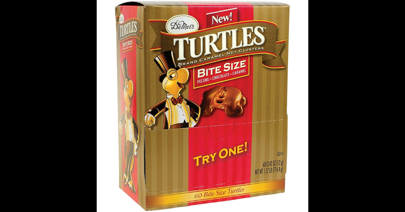 DeMet's Turtles Original bite size consists of a delicious combination of creamy caramel and crunchy pecans for a delightful bite. The Turtles Original bite size is perfect for single-serve snacking and is sold as 60 in a box. Individually wrapped. Kosher Certified OU. 0. 42 oz. single-piece packs. Mini Original Turtles from DeMet's feature milk chocolate, caramel, and pecans.