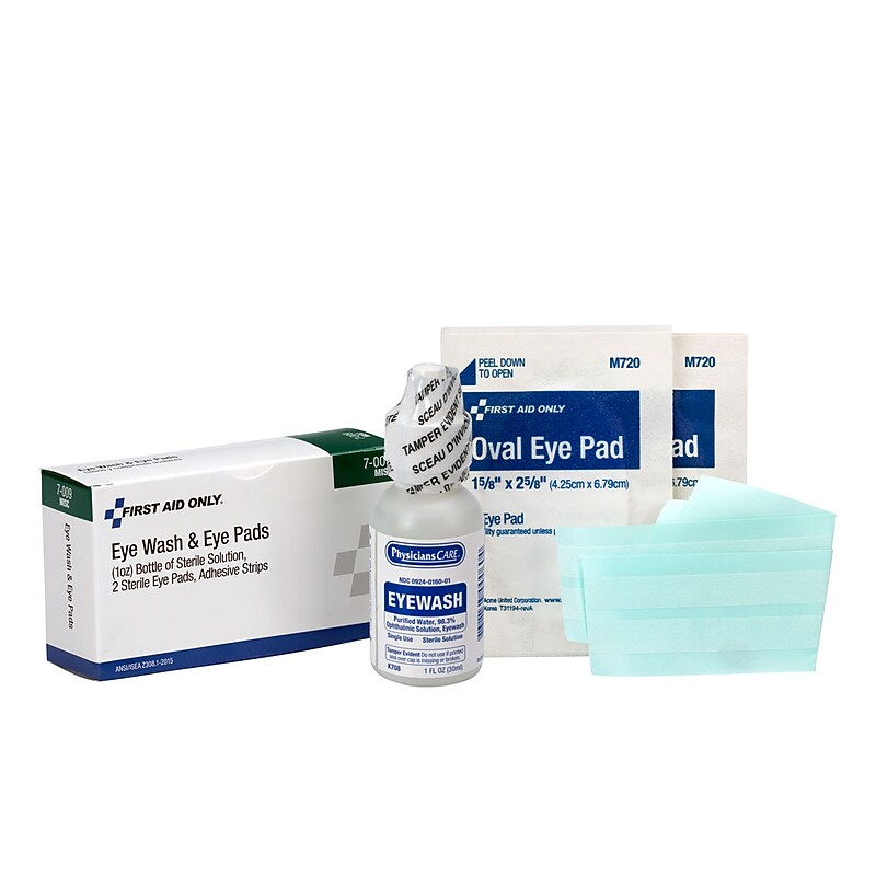 Includes Eye Flushing Solution for Irrigating the Eyes, Eye Pads and Adhesive Strips. Sold as 1 Bottle, 2 Pads, 2 Strips. Perfect for standalone first aid or as a refill for a kit. Kit includes: (2) Adhesive Tape strips 2/Card, (1) 1/2" x 5 yd first aid tape roll, (2) Sterile Eye Pads, (1) Eyewash 1 oz (Screw top). Provides cleansing and a sterile covering for eye injuries. Eye flushing solution for irrigating the eyes. Great addition to any first aid kit. Perfect for standalone first aid or as a refill for a kit. Safety Data Sheet . First Aid Only Eye care pack is a 4 piece kit and is an ideal choice to provide sterile covering for eye injuries.