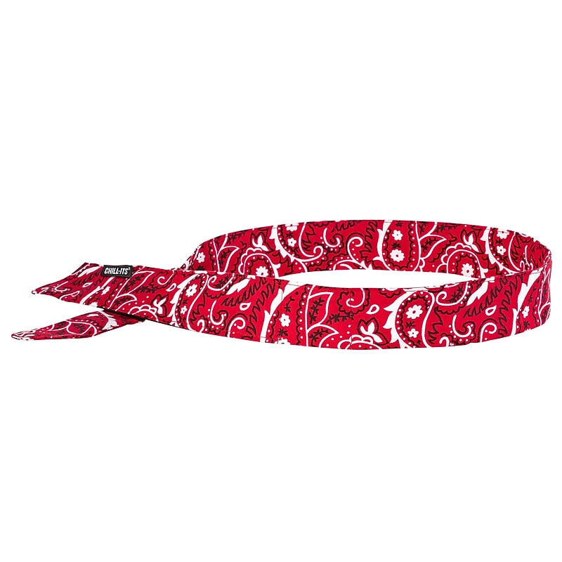 Ergodyne Chill-Its 6705evaporative cooling bandana gets activated by soaking in water for 2 - 5 min remains hydrated for up to 4 hrs. Bandana is easy to use and is ideal for construction, trade or maintenance applications. Evaporative Cooling Bandana. Color: Red Western. Hook & Loop Closure. Soak in water 2-5 minutes to activate. Remains hydrated for up to 4 hours. Re-usable, just re-wet. 24 per carton. Red western. Application: Construction, trades, maintenance, landscaping/grounds, assembly/fabrication, material handling, freight/baggage, warehousing/distribution, iron/steel fabrication. Hook and loop closure. Remains hydrated for up to 4 hrs. Soak in water for 2 - 5 minutes to activate. Ergodyne Chill-Its 6705evaporative cooling bandana is made from activated polymers for durability and has adjustable hook and loop closure that offers easy attachment.