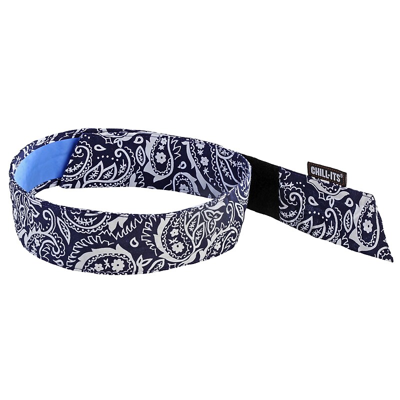 Ergodyne Chill-Its 6705CTevaporative bandana gets activated by soaking in water for 1 min. Bandana with cooling towel has super-evaporative cooling process that keeps you cool and is ideal for construction or trade applications. Evaporative Bandana with Cooling Towel. Color: Navy Western. Breakaway hook and loop closure. Advanced PVA material activates easily and quickly when run under water for one minute. Re-usable, just re-wet. Super-evaporative cooling process helps keep you cool. 6 per carton. Navy western. Advanced PVA. Application: Construction, trades, maintenance, landscaping/grounds, assembly/fabrication, material handling, freight/baggage, warehousing/distribution, landscaping/grounds, assembly/fabrication, material handling. Activates easily and quickly when run under water for one min. Patented design. Ergodyne Chill-Its 6705CTevaporative bandana with cooling towel is made of advanced PVA material for durability and has breakaway hook and loop closure that offers easy attachment.