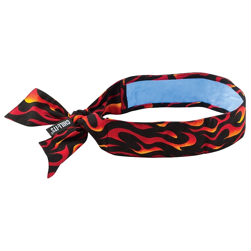Ergodyne Chill-Its 6700CT Flames bandana with cooling towel liner is light in weight and has low profile. Bandana has evaporative cooling process to provide comfort and is ideal for construction or trade applications. Evaporative Cooling Bandana with Cooling Towel. Color: Flames. Tie closure. Advanced PVA material activates easily and quickly when run under water for one minute. Re-usable: just soak in water to re-activate. Super-evaporative cooling process helps keep you cool. Lightweight and low profile; perfect for under hard hats. Flames. Advanced PVA. Application: Construction, trades, maintenance, landscaping/grounds, assembly/fabrication, material handling, freight/baggage, warehousing/distribution, iron/steel fabrication. Activates easily and quickly when run under water for one min. Re-usable, just soak in water to re-activate. Patented design. Lightweight and low profile, perfect for under hard hats. Ergodyne Chill-Its 6700CT Flames evaporative cooling bandana with cooling towel can be reused by soaking in water and features advanced PVA material that offers cooling power.