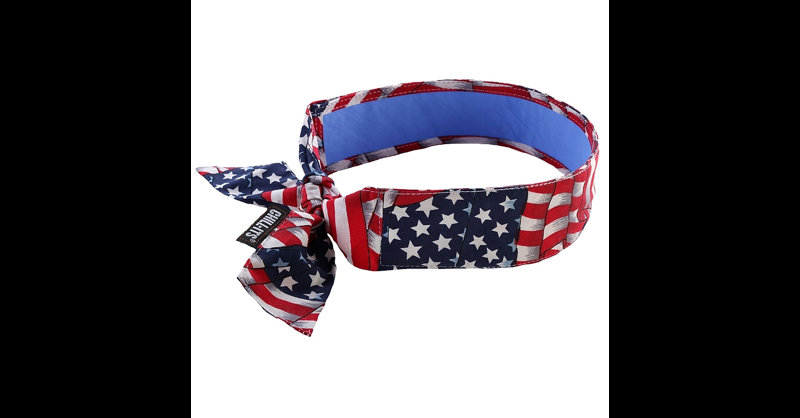 Ergodyne Chill-Its 6700CT Stars & stripes bandana with cooling towel liner is light in weight and has low profile. Bandana has evaporative cooling process to provide comfort and is ideal for construction or trade applications. Evaporative Cooling Bandana with Cooling Towel. Color: Stars & Stripes. Tie closure. Advanced PVA material activates easily and quickly when run under water for one minute. Re-usable: just soak in water to re-activate. Super-evaporative cooling process helps keep you cool. Lightweight and low profile; perfect for under hard hats. Stars and stripes. Advanced PVA. Application: Construction, trades, maintenance, landscaping/grounds, assembly/fabrication, material handling, freight/baggage, warehousing/distribution, iron/steel fabrication. Activates easily and quickly when run under water for one min. Re-usable, just soak in water to re-activate. Patented design. Lightweight and low profile, perfect for under hard hats. Ergodyne Chill-Its 6700CT Stars & stripes evaporative cooling bandana with cooling towel can be reused by soaking in water and features advanced PVA material that offers cooling power.