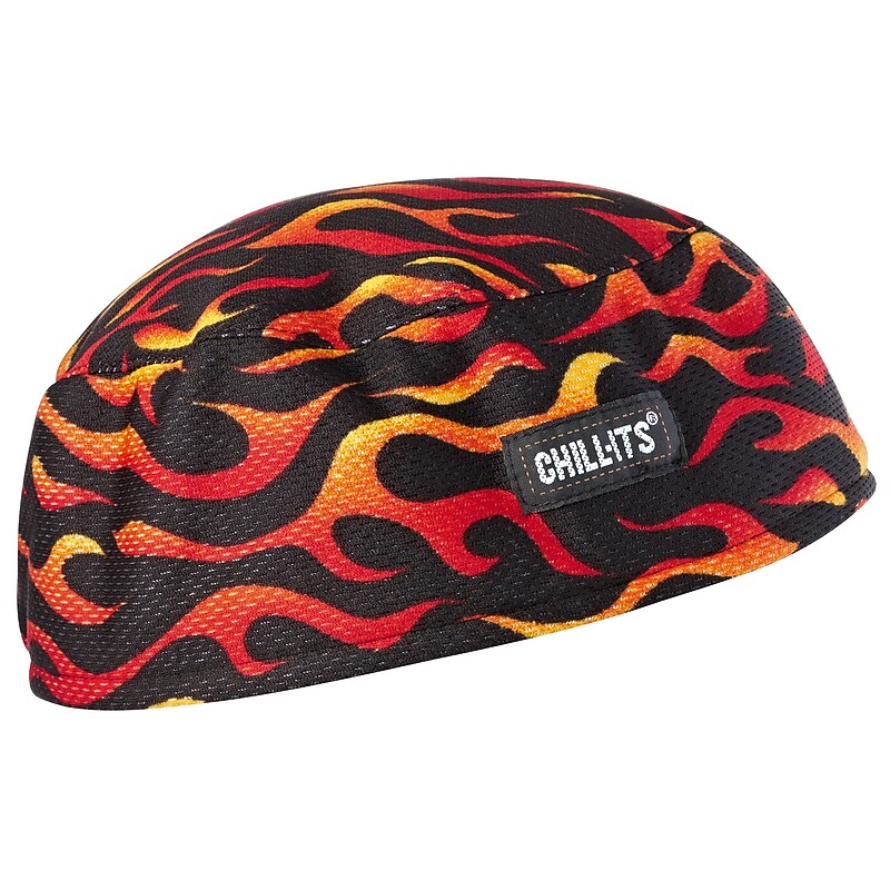 Ergodyne Chill-Its 6630high-performance cap contains wider absorbent terry headband and elastic band for maximum performance/wearability. Cap with cooling absorptives is ideal for construction, trade and maintenance. High-Performance Cap. Color: Flames. One size fits most. Hi Cool moisture management performance fabric. Comfortable to wear under hats, helmets or alone. Wide, absorbent terrycloth band. Flames. Applications: Construction, trades, maintenance, landscaping/grounds, assembly/fabrication, material handling, freight/baggage, warehousing/distribution, iron/steel fabrication. Cooling absorptive, hi cool moisture management. Machine washable. Ergodyne Chill-Its 6630high-performance cap is comfortable to wear under hat/helmet or alone and is made with hi cool fabric that absorbs as well as removes moisture from the head keeping it cool/dry.