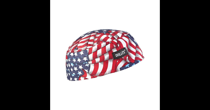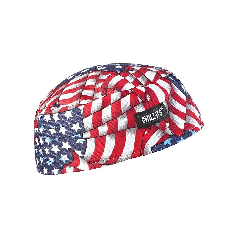 Ergodyne Chill-Its 6630 Stars & stripes high-performance cap contains wider absorbent terry headband and elastic band for maximum performance/wearability. Cap with cooling absorptives is ideal for construction, trade and maintenance. High-performance cap. Hi Cool moisture management performance fabric. Stars & stripes. One size fits most. Applications: Construction, trades, maintenance, landscaping/grounds, assembly/fabrication, material handling, freight/baggage, warehousing/distribution, iron/steel fabrication, hells kitchen. Comfortable to wear under hats, helmets or alone. Wide, absorbent terrycloth band. Star & stripes. Applications: Construction, trades, maintenance, landscaping/grounds, assembly/fabrication, material handling, freight/baggage, warehousing/distribution, iron/steel fabrication. Cooling absorptive, hi cool moisture management. Machine washable. 6 per carton. Ergodyne Chill-Its 6630 Stars & stripes high-performance cap is made with hi cool fabric that absorbs as well as removes moisture from the head keeping it cool/dry and is comfortable to wear under hat/helmet or alone.