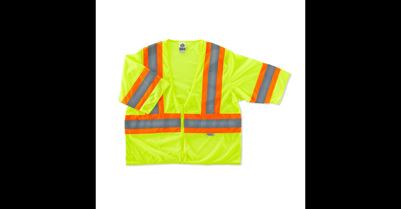 Ergodyne GloWear 8330Z 4XL/5XLclass 3 Hi-vis two-tone vest is made of 3. 3 oz polyester mesh for longer life. Vest with zipper closure includes an inside pockets with 2" reflective tape on 4 1/2" contrasting color background. Size 4XL/5XL. Two-tone safety vest. Class 3. Zipper front. Lime. 1 Each. One inside pocket with 4 1/2"orange strip. Dimensions: 15 1/4"(H) x 1"(W) x 10 1/4"(D). Class 3 two-tone vest has 3M Scotchlite 2" silver reflective stripe centered in the orange stripe. Material: Polyester mesh. Fabric weight: 3. 3 oz. Applications: Road construction, utility crew, survey crew, construction, railway workers, baggage handlers, emergency response, warehouse/distribution. Features high visibility, machine washable. Tape specification: 1 x 360 deg, 2 x vertical. Standards: ANSI 107 class 3. 4XL/5XL. Lime colors for high visibility. Reflective set on 4 1/2" contrasting color background. Applications: Flagging crew, road construction, utility crew, survey crew, construction, emergency response, railway workers. Pockets: One inside. Closure: Zipper. Fits 58" - 64" chest size. Machine washable. Mesh fabric. Ergodyne GloWear 8330Z 4XL/5XLclass 3 Hi-vis two-tone vest is perfectly designed for emergency response, road construction and railway workers applications and comes with a zipper closure.