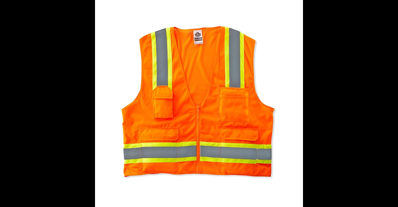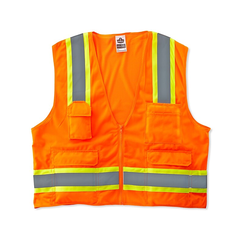 Ergodyne GloWear 8248Z 4XL/5XLclass 2 Hi-vis two-tone surveyor's vest with 2" reflective tape is made of 3. 6 oz poly solid front and 3. 3 oz mesh back for longer life. Vest with zipper closure includes 2 inside and 4 outside pockets. Size 4XL/5XL. Two-tone surveyors vest. Class 2. Zipper front. Orange. 1 Each. Two inside, four outside pocket with 3 1/2" lime stripe. Dimensions: 15 1/4"(H) x 1"(W) x 10 1/4"(D). Class 2 surveyors vest has 2" silver reflective stripe centered in the lime stripe. Material: Poly solid front/mesh back. Fabric weight: 3. 6 oz. / 3. 3 oz. Applications: Road construction, utility crew, survey crew, construction, railway workers, baggage handlers, emergency response. Features high visibility, machine washable. Standards: ANSI certified. 4XL/5XL. 3M Scotchlite 2" and 3 1/2" reflective tape stripes for maximum visibility. Material: 3. 6 oz. poly solid front, 3. 3 oz. mesh back. Pockets: Two inside, four outside. Style: Two-tone. Closure: Zipper. Fits 58" - 64" chest size. Best for folks working near traffic on tasks that make them turn their attention away from traffic. Ergodyne GloWear 8248Z 4XL/5XLclass 2 Hi-vis two-tone surveyor's vest is basically designed for emergency response, road construction/railway workers applications and comes with zipper closure.