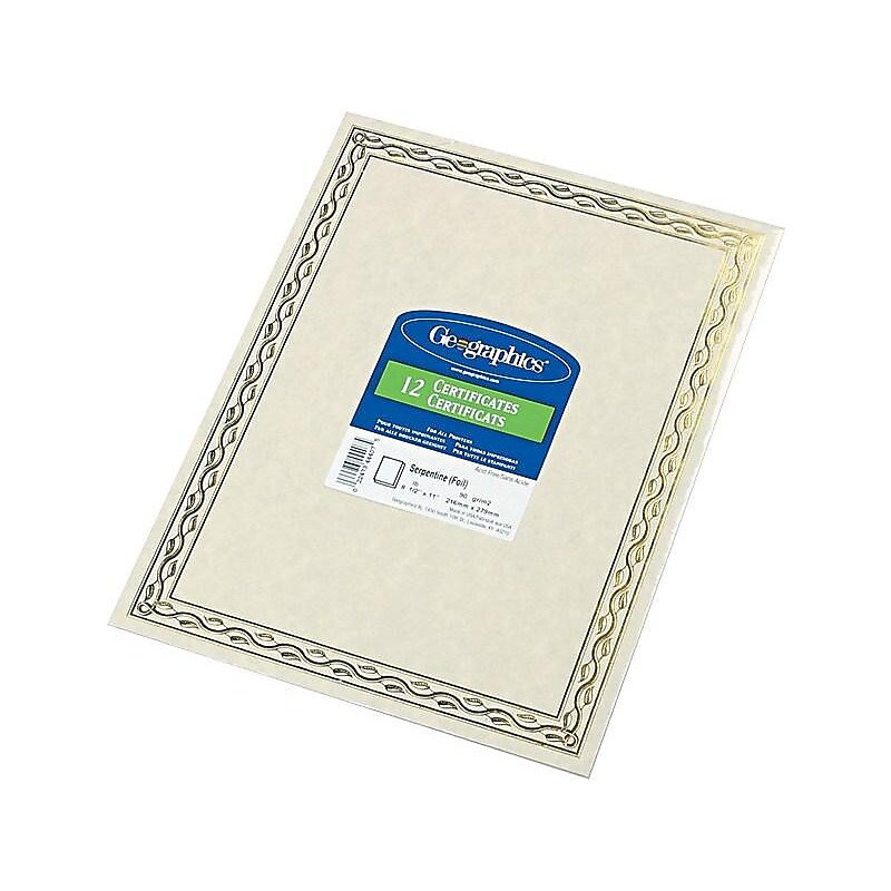 Acknowledge accomplishments on these 24-pound stock parchment paper certificates. These certificates are acid- and lignin-free to help create archival-quality rewards. Each of these 12 Geographics certificates is bordered with a sinuous gold foil border compatible with both inkjet and laser printing devices, making it easy to reward a whole team or department. Printable blank award certificate with a serpentine gold foil border. Archival-quality 24 lb. parchment paper comes color with gold foil seals. Size: 11"W 8. 5"L. 12 sheets per pack. Great for graduation, course completion, awards, and recognition. Perfect for diplomas, achievement award certificates, award certificates, award certificates of recognition, and merit awards. Compatible with inkjet and laser printers. Celebrate achievements, mark graduations, and present prizes by creating beautiful awards on this pack of Geographics blank certificates bordered with serpentine gold foil.