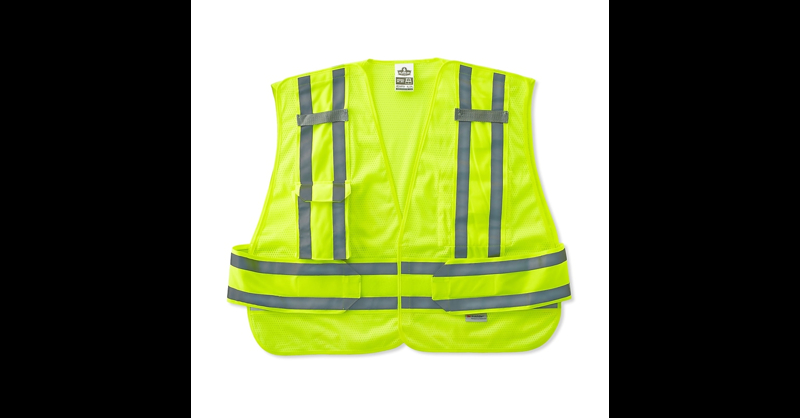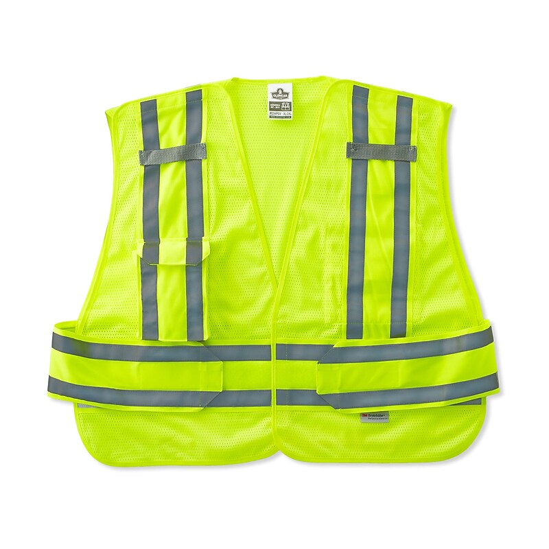 Ergodyne GloWear 8244 3XL+expandable public safety vest having adjustable sides is made of 3. 3 oz polyester mesh for longer life. Vest with radio tabs includes an outside flap on chest and a multi-division inside pocket. Size 3XL. Expandable public safety vest. Hook and loop front. Lime. 1 Each. One outside flap on chest plus one multi-division inside pocket with 4 1/2" silver strip. Dimensions: 15 1/4"(H) x 1"(W) x 10 1/4"(D). Class 2 public safety vest has 3M Scotchlite 4 1/2" silver reflective stripe. Material: Polyester mesh. Fabric weight: 3. 3 oz. Applications: Police, emergency response, security, hazmat. Features high visibility, radio tabs/holders, adjustable sides, machine washable, five-point breakaway design. Standards: ANSI 207 class 2. 3XL+.colors for high visibility. Adjustable sides. Pockets: One outside flap on chest, one multi-division inside. 5 point breakaway design. Radio tabs/holders. Perfect for wearing over turnout gear. Machine washable. Ergodyne GloWear 8244 3XL+expandable public safety vest is perfectly designed for police, emergency response, security and hazmat applications and comes in a 5-point breakaway design.
