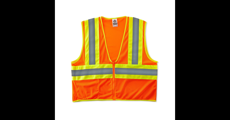 Ergodyne GloWear 8229Z 4XL/5XLclass 2 Hi-vis economy two-tone vest with 2" reflective tape is made of 3. 6 oz polyester solid for longer life. Vest with zipper closure includes a reflective set on 4 1/2" contrasting color background. Size 4XL/5XL. Two-tone safety vest. Class 2. Zipper front. Orange. 1 Each. One inside pocket with 4 1/2" lime strip. Dimensions: 15 1/4"(H) x 1"(W) x 10 1/4"(D). Class 2 two-tone safety vest has 2" silver reflective stripe centered in the lime stripe. Material: Polyester mesh. Fabric weight: 3. 3 oz. Applications: Road construction, utility crew, survey crew, construction, railway workers, baggage handlers, emergency response, warehouse/distribution. Features high visibility, machine washable. Standards: ANSI/ISEA class 2. 4XL/5XL. 2" reflective tape stripes for maximum visibility. Material: 3. 3 oz. polyester mesh. Applications: Road construction, utility crew, survey crew, construction, railway workers, baggage handlers, emergency response, warehousing/distribution. Pockets: One inside. Style: Two-tone. Closure: Zipper. Fits 58" - 64" chest size. Best for folks working near traffic on tasks that make them turn their attention away from traffic. Ergodyne GloWear 8229Z 4XL/5XLclass 2 Hi-vis economy two-tone vest is perfectly designed for emergency response, road construction and warehousing applications and comes with a zipper closure.