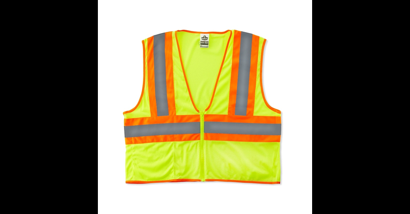 Ergodyne GloWear 8229Z 4XL/5XLclass 2 Hi-vis economy two-tone vest with 2" reflective tape is made of 3. 6 oz polyester solid for longer life. Vest with zipper closure includes a reflective set on 4 1/2" contrasting color background. Size 4XL/5XL. Two-tone safety vest. Class 2. Zipper front. Lime. 1 Each. One inside pocket with 4 1/2"orange strip. Dimensions: 15 1/4"(H) x 1"(W) x 10 1/4"(D). Class 2 two-tone safety vest has 2" silver reflective stripe centered in the orange stripe. Material: Polyester mesh. Fabric weight: 3. 3 oz. Applications: Road construction, utility crew, survey crew, construction, railway workers, baggage handlers, emergency response, warehouse/distribution. Features high visibility, machine washable. Standards: ANSI/ISEA class 2. 4XL/5XL. 2" reflective tape stripes for maximum visibility. Material: 3. 3 oz. polyester mesh. Applications: Road construction, utility crew, survey crew, construction, railway workers, baggage handlers, emergency response, warehousing/distribution. Pockets: One inside. Style: Two-tone. Closure: Zipper. Fits 58" - 64" chest size. Best for folks working near traffic on tasks that make them turn their attention away from traffic. Ergodyne GloWear 8229Z 4XL/5XLclass 2 Hi-vis economy two-tone vest is perfectly designed for emergency response, road construction and warehousing applications and comes with a zipper closure.