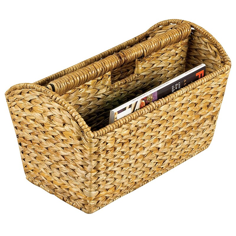 Household Essentialsbanana leaf magazine rack has two side pockets which are ideal for storing magazines, novels-in-progress, pre-sorted mail or even remote controls. Rack has rust-proof steel-wire inner frame for strength and stability. Two-sided magazine holder with handle for easy carrying. Hand-woven banana leaf around sturdy steel frame. Dimensions: 10"(H) x 16"(W) x 10 1/4"(D). Features rust-proof steel wire inner frame for strength and stability. Coated to prevent mold and mildew. Humidity tested. One cubic foot of storage space. Split in the middle with divider that includes built-in carrying handle. Household Essentialsbanana leaf magazine rack controls the clutter in your home and is coated to prevent mold or mildew.