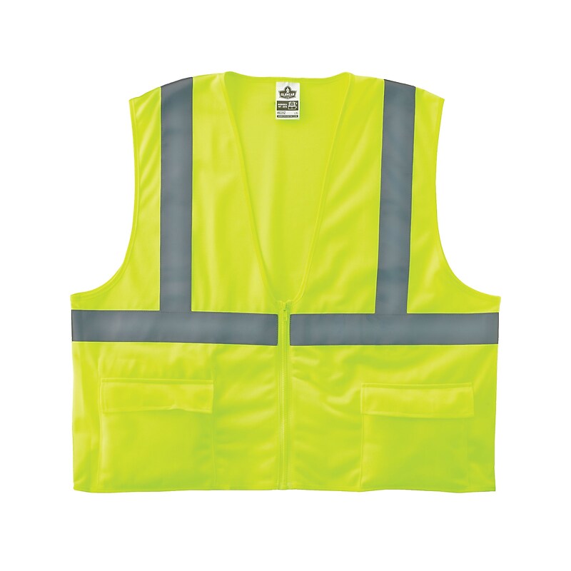 Ergodyne GloWear 8225Z 4XL/5XLclass 2 Hi-vis standard vest with 2" reflective tape is made of 3. 6 oz polyester solid for longer life. Vest with zipper closure includes an inside and 2 outside pockets for more comfort. Size 4XL/5XL. Standard safety vest. Class 2. Zipper front. Lime. 1 Each. One inside, two outside pocket. Dimensions: 15 1/4"(H) x 1"(W) x 10 1/4"(D). Class 2 standard vest has 3M Scotchlite 2" silver reflective stripe. Material: Polyester solid. Fabric weight: 3. 6 oz. Applications: Road construction, utility crew, survey crew, construction, railway workers, baggage handlers, emergency response, warehouse/distribution. Features high visibility, machine washable. Standards: ANSI certified. 4XL/5XL. Lime colors for high visibility. Loaded with glass bead to keep the vest safe and comfortable. Material: 3. 6 oz. polyester solid. Applications: Road construction, utility crew, survey crew, construction, railway workers, baggage handlers, emergency response, warehousing/distribution. Pockets: One inside, two outside. Style: Standard. Closure: Zipper. Fits 58" - 64" chest size. 2" level 2 reflective tape. Ergodyne GloWear 8225Z 4XL/5XLclass 2 Hi-vis standard vest is perfectly designed for emergency response, road construction and warehousing applications and comes with a zipper closure.
