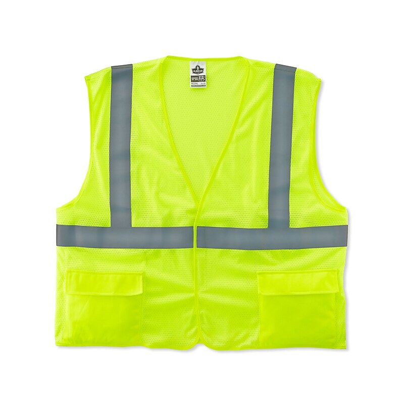 Ergodyne GloWear 8220HL 4XL/5XL lime class 2 Hi-vis standard vest with 2" reflective tape is made of 3. 3 oz polyester mesh for longer life. Vest with hook and loop closure includes an inside and 2 outside pockets for more comfort. Size 4XL/5XL. Standard safety vest. Class 2. Hook and loop front. Lime. 1 Each. One inside, two outside pocket. Dimensions: 15 1/4"(H) x 1"(W) x 10 1/4"(D). Class 2 standard vest has 3M Scotchlite 2" silver reflective stripe. Material: Polyester mesh. Fabric weight: 3. 3 oz. Applications: Road construction, utility crew, survey crew, construction, railway workers, baggage handlers, emergency response, warehouse/distribution. Features high visibility, machine washable. Standards: ANSI certified. 4XL/5XL. Lime colors for high visibility. Loaded with glass bead to keep the vest safe and comfortable. Material: 3. 3 oz. polyester mesh. Applications: Road construction, utility crew, survey crew, construction, railway workers, baggage handlers, emergency response, warehousing/distribution. Pockets: One inside, two outside. Style: Standard. Closure: Hook and loop. Fits 58" - 64" chest size. 2" level 2 reflective tape. Ergodyne GloWear 8220HL 4XL/5XL lime class 2 Hi-vis standard vest is perfectly designed for road construction, emergency response and warehousing applications and comes with hook and loop closure.
