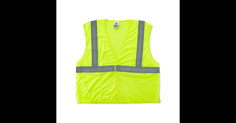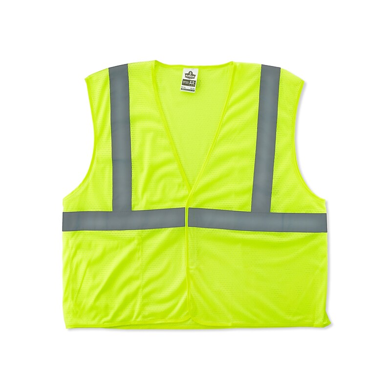 Ergodyne GloWear 8210HL 4XL/5XLclass 2 Hi-vis economy vest with 2" reflective tape is made of 3. 3 oz polyester mesh for longer life. Vest with hook and loop closure is used by railway workers, utility crew and baggage handlers. Size 4XL/5XL. Economy safety vest. Class 2. Zipper front. Lime. 1 Each. One inside pocket. Dimensions: 15 1/4"(H) x 1"(W) x 10 1/4"(D). Class 2 economy safety vest has 2" silver reflective stripe. Material: Polyester mesh. Fabric weight: 3. 3 oz. Applications: Road construction, utility crew, survey crew, construction, railway workers, baggage handlers, emergency response, warehouse/distribution. Features high visibility, machine washable. Tape specification: 1 x 360 deg, 2 x vertical. Standards: ANSI certified. 4XL/5XL. Lime colors for high visibility. Features 360 deg around torso. Material: 3. 3 oz. polyester mesh. Applications: Road construction, utility crew, survey crew, construction, railway workers, baggage handlers, emergency response, warehousing/distribution. Pockets: One inside. Closure: Hook and loop. Fits 58" - 64" chest size. Visibility enhancing materials like retroreflective tape and fluorescent colors. Machine washable. Ergodyne GloWear 8210HL 4XL/5XLclass 2 Hi-vis economy vest is perfectly designed for road construction, emergency response and warehousing applications and comes with hook and loop closure.