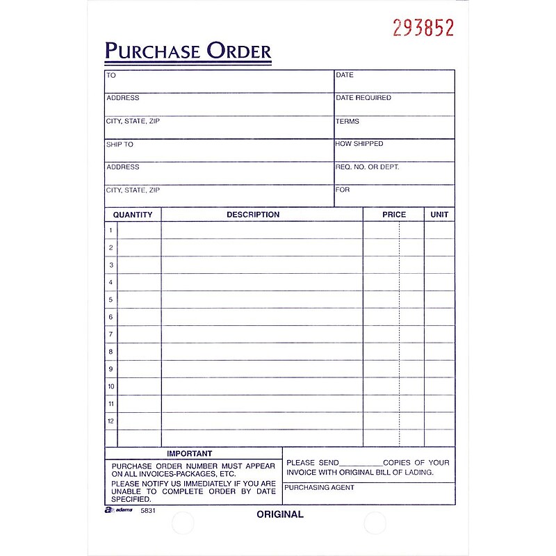 Reliable, complete record for company purchases. 3-part carbonless purchase order book in white, canary, and pink paper sequence. Consecutively numbered within each book. Space at top for company stamp. Wraparound cover attached to back of book to place between sets. 50 sets per book.
