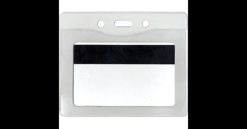 Cord/Clip style. Pre-punched for chain or clip use. Durable, sturdy vinyl holder is ideal for ID cards or name badges. 50 holders per box. Horizontal style. 3 7/8 x 2 5/8" insert size.