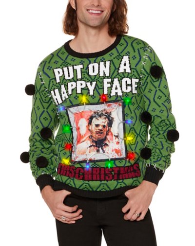 Buy Light-Up Happy Face Leatherface Christmas Sweater - Texas Chainsaw Mas by Spirit Halloween for $44.99 at @ Spirithalloween.com