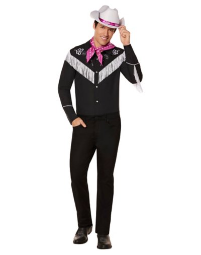 Giddy up, cowboy! Become Barbies other half this Halloween when you wear this officially licensed Western Ken Costume. This western-style kit includes a black cowboy shirt and a pink bandana, giving you everything you need to nail the look. Officially licensed Includes: Shirt Bandana Crewneck Long sleeves Button closure Material: Polyester Care: Spot clean Imported Note: Pants, hat, and shoes sold separately.