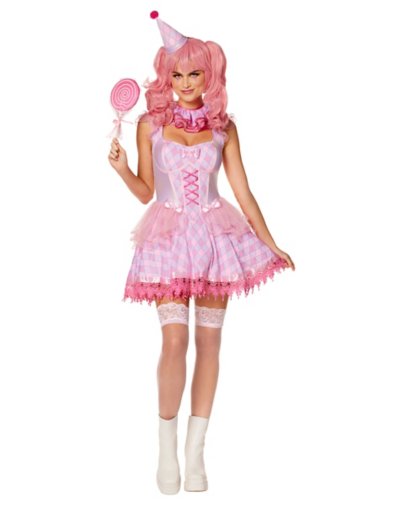 You'll be the prettiest clown in the big top with this Pastel Clown costume. This costume includes everything you need to channel your inner carnie. Includes: Dress Removable collar Choker necklace Hat Lollipop prop Short sleeves Pullover style Material: Polyester, spandex, polyurethane Care: Spot clean Imported Note: Stockings, shoes and other accessories not included.