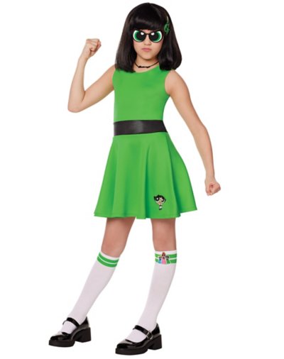 Do you have what it takes to be the toughest Powerpuff Girl? You'll look gorgeous when you dress up as Buttercup! This Buttercup costume includes a green dress with an attached black belt and an official Buttercup logo, a fun hair accessory, wide-eyed sunglasses, a necklace displaying Buttercup's name, and a pair of crisp white and green knee-high tights. Officially licensed Includes: Dress Hair accessory Sunglasses Necklace Knee high tights Pullover style Material: Polyester, spandex, zinc alloy, iron Care: Hand wash Imported Note: Shoes sold separately.