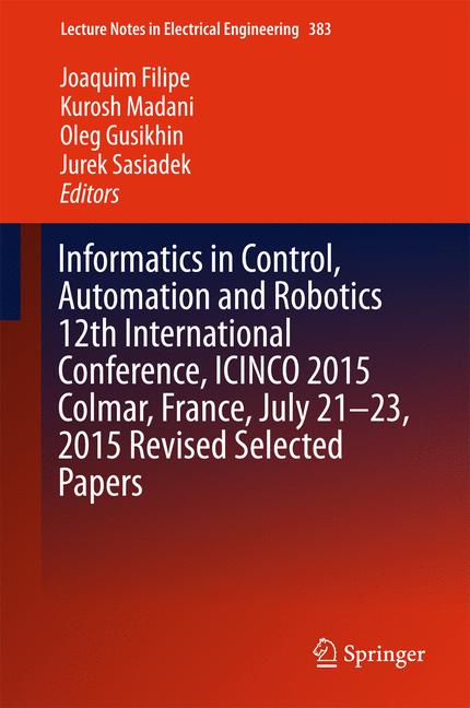 The present book includes a set of selected extended papers from the 12th International Conference on Informatics in Control, Automation and Robotics (ICINCO 2015), held in Colmar, France, from 21 to 23 July 2015. The conference brought together researchers, engineers and practitioners interested in the application of informatics to Control, Automation and Robotics. Four simultaneous tracks will be held, covering Intelligent Control Systems, Optimization, Robotics, Automation, Signal Processing, Sensors, Systems Modelling and Control, and Industrial Engineering, Production and Management. Informatics applications are pervasive in many areas of Control, Automation and Robotics. ICINCO 2015 received 214 submissions, from 42 countries, in all continents. After a double blind paper review performed by the Program Committee, 14% were accepted as fullpapers and thus selected for oral presentation. Additional papers were accepted as short papers and posters. A further selection was made after the Conference, based also on the assessment of presentation quality and audience interest, so that this book includes the extended and revised versions of the very best papers of ICINCO 2015. Commitment to high quality standards is a major concern of ICINCO that will be maintained in the next editions, considering not only the stringent paper acceptance ratios but also the quality of the program committee, keynote lectures, participation level and logistics.