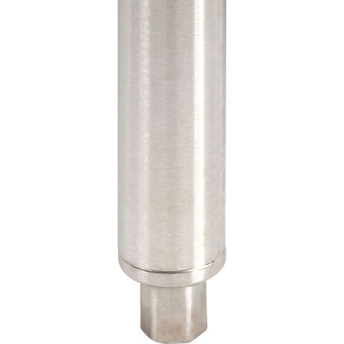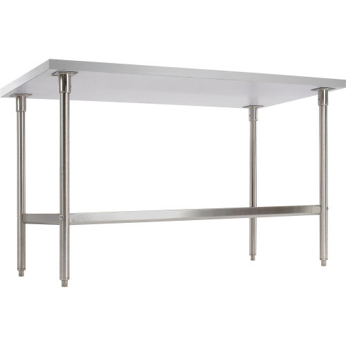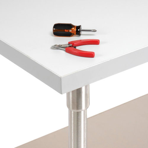 PLASTIC TOP WORKBENCHES WITH STAINLESS STEEL LEGS Lower Shelf Plastic top provides a smooth, tough work surface that's fit for any application including kitchens, labs and more. Durable, easy-to-clean 1-5/8" thick light gray top is made from high pressure plastic laminate with a wood core to withstand heavy use. Legs are made from 16 gauge, 304 stainless steel that resists chemicals and most solvents. 1-5/8" diameter tubular legs include adjustable leveling feet. Measures 34"H. Workbench has a lower shelf for added storage space.