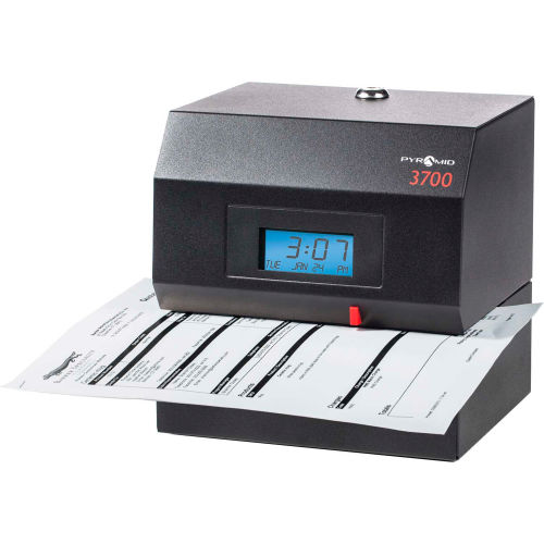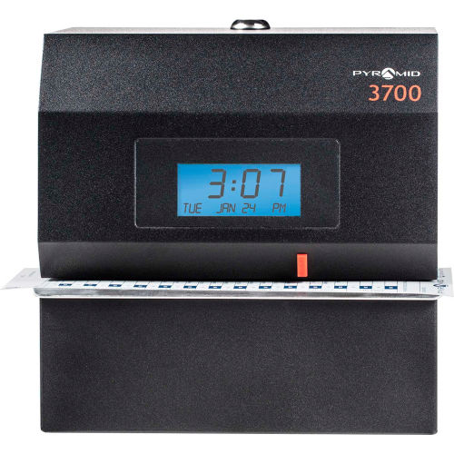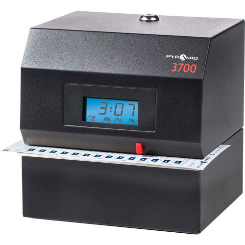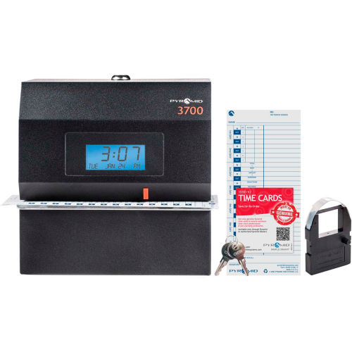 The Pyramid Time Systems model 3700 heavy duty time clock and document stamp holds up to heavy wear and tear. The protective steel casing is ideal for garages, manufacturing, warehouse, industrial, or construction settings. Track employee start times, break times, lunch times and finish times on a weekly time card, or select from 14 pre-programmed message options to stamp invoices, attendance logs, legal paperwork or other time-sensitive documents. The side-loading time card and document feed accommodates left or right-hand orientation. An alignment guide helps line up punches. Prints the date and time (AM/PM or military time format) on weekly employee time card. Includes 3700 heavy duty time clock/document stamp, 25 time cards, one ink ribbon cartridge and two security keys. Made in USA. Features: Steel construction withstands heavy duty workplaces, such as industrial, warehouse or garage environmentsExtremely reliable time clock manufactured since 2002, tracks employee time, manages job costing or time stamps documentsPrints date and time, or select from 14 preprogrammed messages for stamping time-sensitive documentsSide loading document feed accommodates right or left-hand printing; uses only genuine Pyramid 4000R ribbonAutomatically resets for short months, leap year & daylight saving timeIncludes 25 time cards, ribbon, 2 security keys and user guideMade in USA.