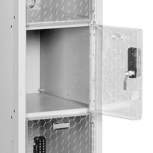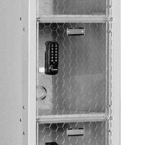 ✓ Scratch-resistant, transparent polycarbonate doors ✓ Digital lock with keypad to keep belongings secure ✓ Finger-pull friction hasp Give your employees, students, and guests a secure place to store their belongings with this set of Global Industrial Clear View Lockers. Featuring scratch-resistant, transparent polycarbonate doors to permit the viewing of contents, these 16-person lockers are engineered specifically for use in schools, commercial buildings, factory facilities, and more. Its steel surface, with an attractive & durable powder coat finish, ensures a long service life while the digital lock keeps contents safe. Ideal for accommodating a lot of people in a small area, these lockers have an included coat rod for additional garment storage. Easily programmable, the digital lock can be used in either Public mode for single-use passcodes or Private mode for longer-term individual use. Assembly required. Limited 1-Year Warranty. Includes one battery & one master key per lock, and one blank number plate per door Overall Dimensions: 72"W x 18"D x 78"H Lockers must be anchored securely to floors. Mounting anchors/hardware sold separately.