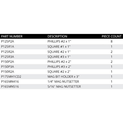 Made from S2 modified shock resistant steel for professional performance and durability. Proprietary precision CNC machined tips for excellent fit in fastener recess. Patented spiral torsion zone absorbs impact and extends bit life. Shock resistant storage case securely holds bits in place.