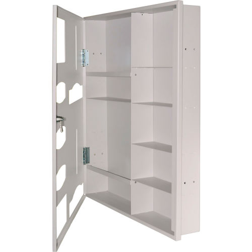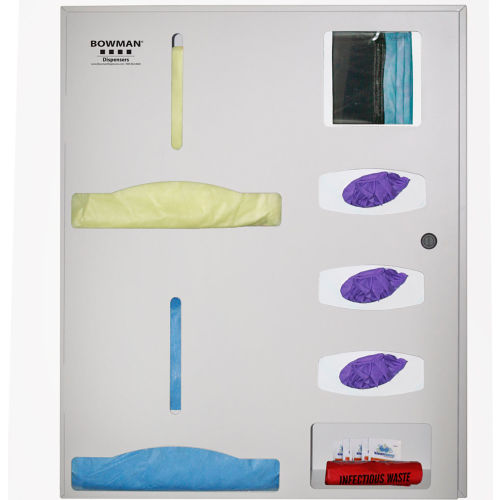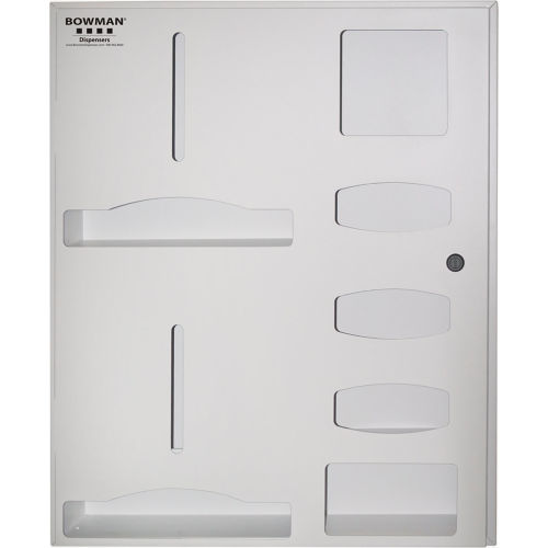 Semi-Recessed - Protective Wear Organizer - Double Gown Holds gowns, aprons, or coveralls/jumpsuits, three boxes of gloves, one box of shield masks, and miscellaneous items. Low Profile Keyless locking mechanism. Screw holes in sides to mount to stud framing in wall. Quartz Beige Powder-Coated Steel. Made in the USA.