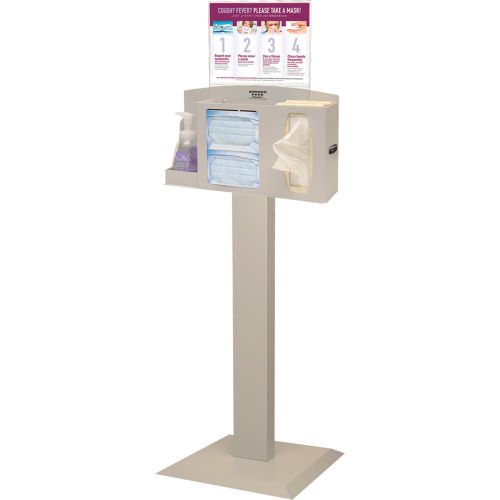 Cover Your Cough Compliance Kit BOWMAN Respiratory Hygiene Station (RS001-0212) Holds one bottle of hand sanitizer, two boxes of masks, and one - two boxes of facial tissues Quartz Beige ABS Plastic BOWMAN Floor Stand (KS010-0412) Quartz Beige Powder-Coated Steel BOWMAN Sign Holder - Horizontal (MP-075) Holds 11"x8.5" signage Clear PETG PlasticMade in the USAAssembly hardware included.