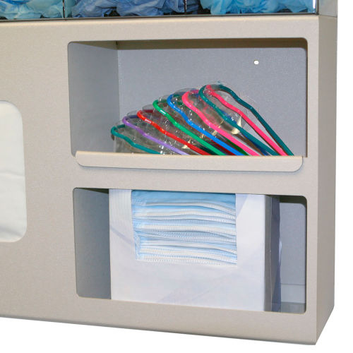 Protective Wear Organizer - Surgical Holds protective equipment or miscellaneous items in bulk, coveralls/jumpsuits, aprons, or gowns, and miscellaneous items. Four compartments. Top loading, top and bottom dispensing. Hinged lid Removable shelf for one large storage area. Keyholes for wall mounting. Quartz Beige ABS and Clear PETG Plastic. Made in the USA.