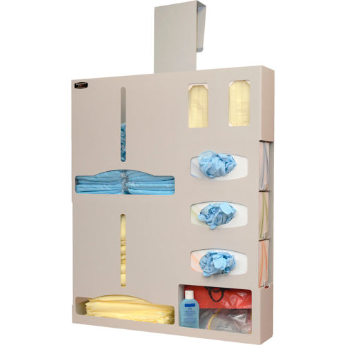 Protective Wear Organizer - Double Gown: Holds gowns, aprons, or coveralls/jumpsuits, three boxes of gloves, two boxes of earloop masks, and miscellaneous items. Keyholes for wall mounting or cutout for use with a BOWMAN Hanger. Quartz Beige ABS Plastic. Made in the USA.