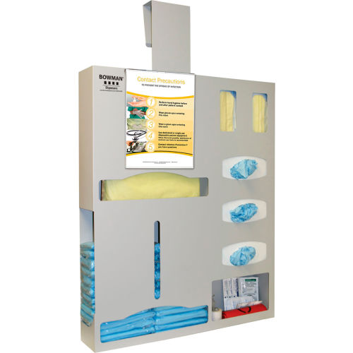 Protective Wear Organizer - Double Gown: Holds gowns, aprons, or coveralls/jumpsuits, three boxes of gloves, two boxes of earloop masks, and miscellaneous items. Keyholes for wall mounting or cutout for use with a BOWMAN Hanger. Quartz Beige Powder-Coated Aluminum. Made in the USA.