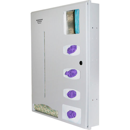 Semi-Recessed - Protective Wear Organizer - Launderable Gown Holds gowns, aprons, or coveralls/jumpsuits, three boxes of gloves, one box of shield masks, and miscellaneous items. Low Profile ADA and CMS Wall Protrusion compliant. Keyless locking mechanism. Screw holes in sides to mount to stud framing in wall. Quartz Beige Powder-Coated Steel. Made in the USA.