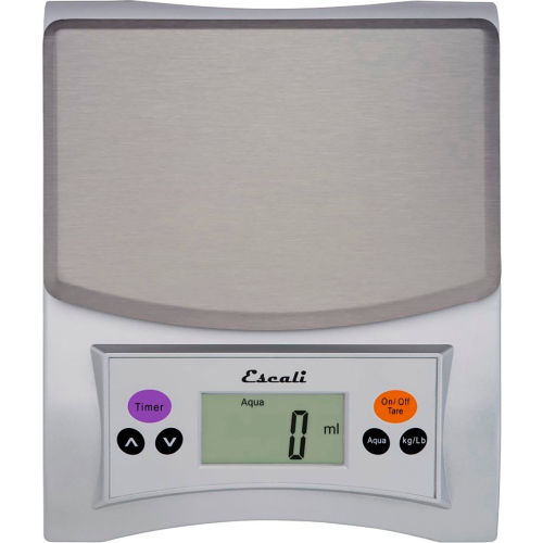 True Liquid Measuring The Escali Aqua Digital Liquid Measuring Scale is a multifunctional scale with unique Features:. Besides weighing in ounces or grams, you can easily measure your recipe ingredients in fluid ounces and milliliters. All liquids have their own density. With the Escali Aqua scale, you have the option to adjust for varying densities of the liquid you are weighing. This unique feature allows you to get an exact reading regardless of the density of the liquid. Features: Capacity : 11 lb or 5000 gramMeasuring units: Pounds/Ounces, Fluid Ounces, Grams and MilliliterAccurately measures in 0.05 oz or 1 gramDisplays Ounces in fractions (up to 1/16 ounce) or decimalsAdjustment feature for weighing liquid with different densities. Liquid Density TableAutomatic shut-off feature ensures long battery lifeTare feature (Add & Weigh)Built in kitchen timer, 99 min. 59 sec.One heavy duty 9V battery included (AC adaptor optional)Removable Stainless Steel platform.