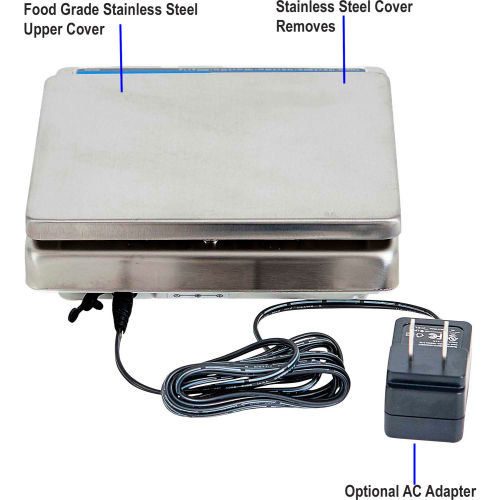 The Brecknell 6030 IP67 Portion Control Scale is constructed with a food grade stainless steel upper cover and a removable stainless steel platter for easy cleaning making it ideal for use in wash-down environments. Its capacity is 5000g, lb, 160 oz. and weighs in g, lb, oz and lb/oz. Operates on 9V battery (included) or AC adapter (sold separately). Also features low battery/overload indicator and auto off feature.