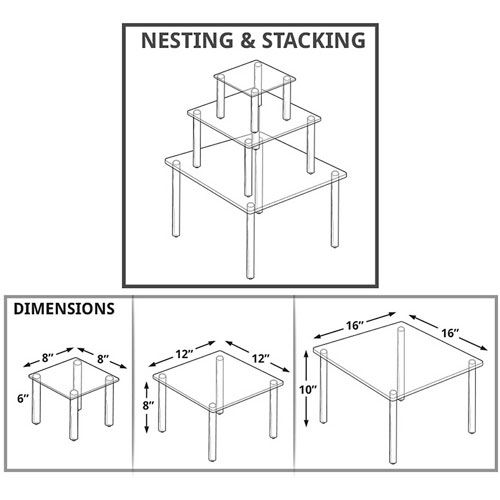 This acrylic square riser set consists of 3 individual, different sized risers to showcase a variety of items. The small riser measures 8"W x 8"L x 6"H. The medium riser measures 12"W x 12"L x 6"H and the large riser measures 16"W x 16"L x 10"H. These risers are made of a durable top quality acrylic and are a great way to maximize your product visibility.