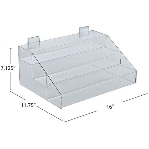 This three-tier step display measures 16"W x 11.75"D x 7.125"H. Each step measures 3.75"D and includes a 2.25"H front edge lip. Includes two sign holder clips. Choose to add a clear acrylic header to your display. Includes 2 Acrylic Sign Holder clips.