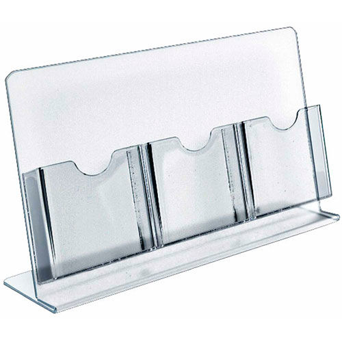 The L-Shape slanted clear acrylic back with attached clear brochure holder is a great literature display for restaurant menus, hotel concierge desks, hotel registration desks, or any marketing material.