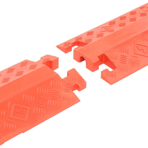 SINGLE CABLE GUARD - DROP OVER General Purpose - Ideal for vehicles and pedestrian traffic. Helps protect air lines and electric cables from damage. Eliminates the need to bury or string lines overhead. Non-conductive polyurethane resists weather and abrasion. Diamond plate surface for increased traction and built-in handholds for easy transport. Accommodates cables 1-1/4" outside diameter. Drop over design allows for temporary re-routing of single cable and hose lines including fragile fiber optic telecommunications cable. Modular interlocking design is lightweight and easy to transport, setup, disassemble, and store. Quick solution to protect single runs of cable and hose lines.