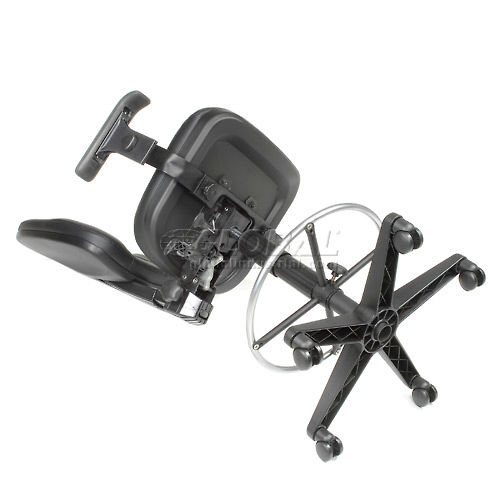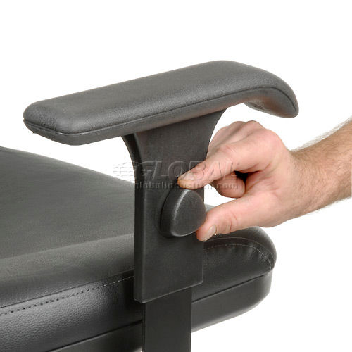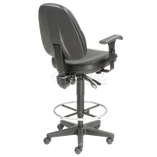 Interion Leather Stool - Operator Synchro Mechanism - 360 Footrest With Armrests Back and seat angles synchronize to your body's position for daylong comfort. Adjustable stool has pneumatic 24 to 29"H adjustable seat and 7-1/2 to 11"H adjustable footrest ensure proper foot and leg support. Generously sized seat is 3-1/2" thick padding upholstered with genuine black leather seating surfaces that have a waterfall edge to reduce knee stress and improve circulation. Contoured 2-1/2"H adjustable back ensures improved posture with lumbar support. 3" vertical and 1" side-to-side adjustable T-arms align arms and wrists for keyboard use. Polypropylene steel reinforced base has 2" carpet casters. All adjustable stools include a 2 Year Limited Warranty. Seat measures 18" sq. and back measures 17-1/2"W x 19"H. Brand is Interion By Global Industrial. Easy assembly. Also available, optional stool glides can replace casters for stationary use.