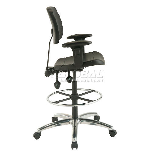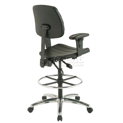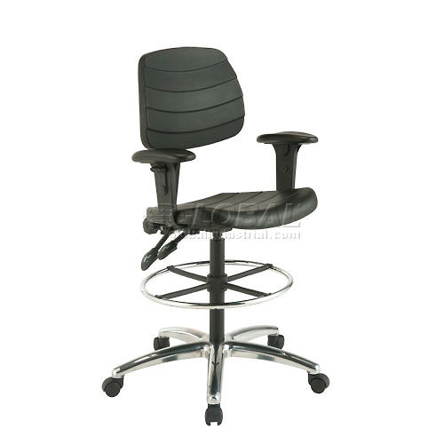 Interion Deluxe 6 Way Adjustable Polyurethane Stool With Armrests The Most Comfortable Shop Stool Available This Adjustable Work Stool from Interion By Global Industrial Offers Comfort and Ergonomic Support You Won't Find Anywhere Else This Deluxe Polyurethane Stool is ergonomically designed and engineered to provide proper work posture that improves productivity and helps reduce fatigue. Our easy-to-clean, washable self-skinned polyurethane shop stool resists chemicals and lubricants making it ideal for lab, warehouse and workshop environments. The ribbed seat and back of this industrial polyurethane stool provides comfort and support for extended sitting periods. High density foam core and seat plate reinforcement offer wear and puncture resistance to ensure long life of this work bench stool. Ribbed back is contoured for lumbar support. Features large seat and back; Seat measures 20"W x 18"D x 2" thick. Back measures 17-1/2"W x 13-1/2"H x 1-1/2" thick. Waterfall edge seat helps improve leg circulation. Extra large 26" diameter polished aluminum 5-blade base. This swivel stool includes a 20" diameter chrome foot ring that is height adjustable. 23 -28" pneumatic seat height adjustment. Other ergonomic support featured on this adjustable shop stool includes back angle and back height adjustment. Armrests measure 4"W x 10"L and are contoured for full arm support. Armrests are adjustable up to 3" vertically and 1-1/2" side-to-side. Includes both swivel casters for easy mobility and non-marring floor glides for stationary positioning. Easy assembly. 1 Year Limited Warranty.